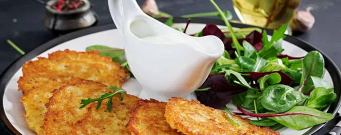 Για να παραμείνει η ζύμη ανοιχτόχρωμη και να μην σκουρύνει, θα πρέπει να προσθέσετε λίγη ξινή κρέμα. Η ξινή κρέμα όχι μόνο μαλακώνει τη μάζα, αλλά και επιβραδύνει την οξείδωση των πατατών, είναι μέσω αυτής της διαδικασίας που η ζύμη αποκτά μια δυσάρεστη γκριζωπή απόχρωση. Και χάρη στην ξινή κρέμα, τα ντερουνάκια θα έχουν κρεμώδες χρώμα και τρυφερή υφή.
